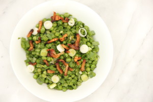 In the same pan and with two tablespoons of the bacon fat (if you don't have enough bacon fat just add some olive oil), add the onions, peas, mint and stock. Cook for a few minutes till liquid is reduced. Season with salt and pepper to taste.