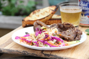 Add the cabbage, cucumber, carrot, mint and red onion into the bowl and toss with the dressing. Top with peanuts and serve with flank steak or Korean short ribs.