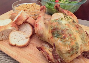 Place the stuffed chicken on the onions and garlic and coat it with a tablespoon of olive oil. Bake the chicken for about 15 to 20 minutes and then reduce the heat to 350 degrees and cook for about 1 hour (depends on the size of your chicken). Once the chicken is nicely golden and temperature measured with a meat thermometer reaches 175 degrees.