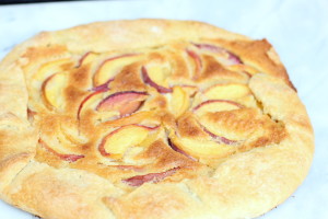 Add the peach topping over the almond filling and fold the edges in towards the center of the tart. Brush dough with the cream and sprinkle with the sugar.
