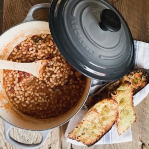 While the beans cook, set your oven to broil with the rack set near the top of the oven. Slice a baguette lengthwise and drizzle with some olive oil. Broil till nicely browned, remove from the oven, season with salt, pepper and dried oregano. Serve the beans in a bowl with a chunk of the grilled bread. Enjoy!
